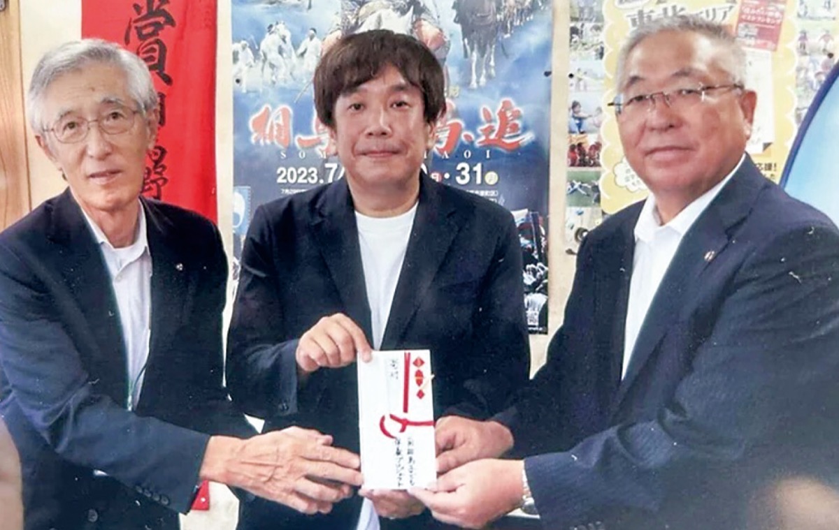 フードバンクはだのを運営している「南相馬子ども保養プロジェクト(PJ)」の福嶋秀樹さんが9月20日、南相馬市の門馬和夫市長のもとを訪れ、寄付金10万円の目録を手渡した。