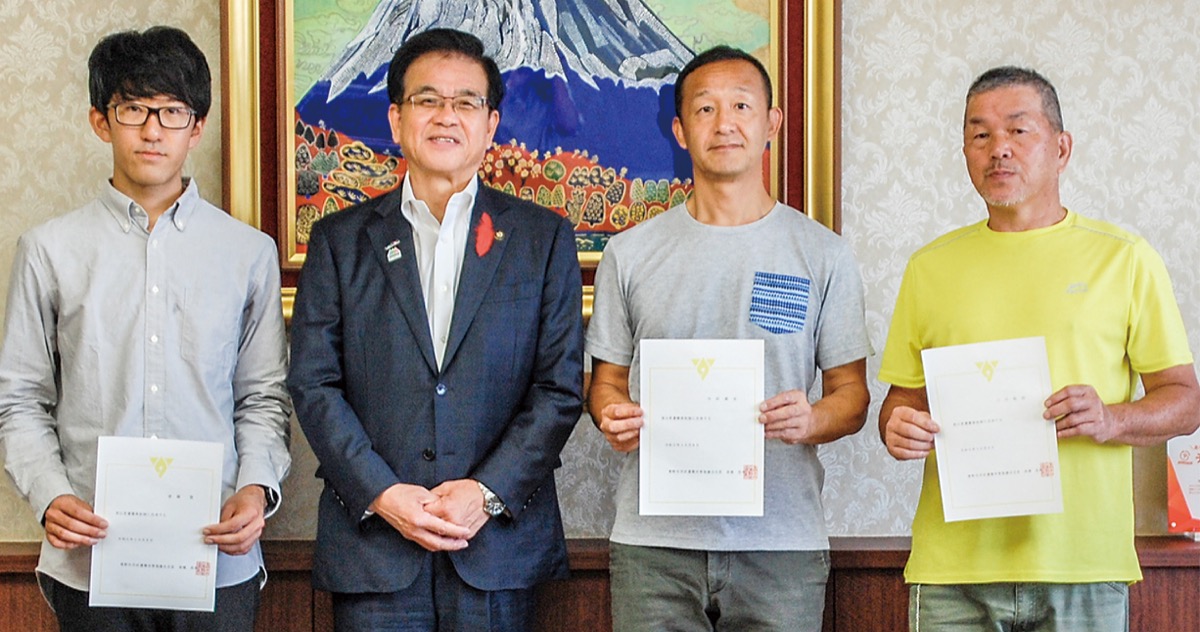秦野市役所本庁舎で10月6日、秦野市丹沢遭難対策協議会が「登山者遭難救助隊」の新入隊員任命式を行った。当日は、新たに隊員に任命された遠藤慧さん(29)、中村篤史さん(53)、三川悦治さん(66)の3人に、協議会の会長である高橋昌和市長から委嘱状が授与された。