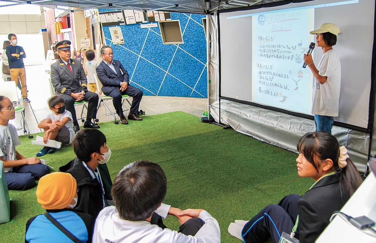 秦野駅改札前を会場に10月7日、秦野市内の児童・生徒らがヤマビルをテーマに行った自由研究の成果を披露する発表会が行われた=写真。ヤビツ峠レストハウス 丹沢MON合同会社主催、小田急電鉄(株)協力。