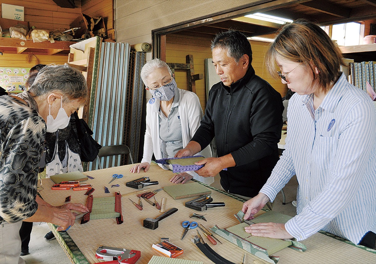 午前中は、曽屋水道記念公園の見学とともに、大道商和会でかまか商店の豆菓子作り体験、渡辺畳店のミニ置き畳作り体験を実施。東京都からの参加者は、「落花生は千葉のイメージだったので、秦野の名産と初めて知った」、海老名市からの参加者は「秦野に降り立ったのは初めて。作った畳には人形や花瓶を置いて活用したい」と話した。