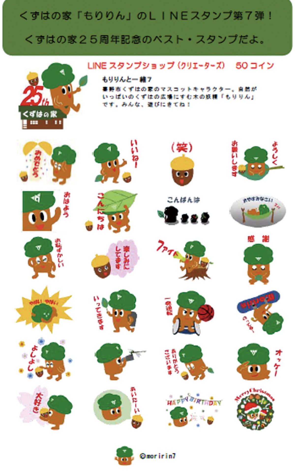 今回は、もりりんがいるくずはの広場にある自然観察施設くずはの家の開館25周年を記念したベスト・スタンプ。可愛らしく使い勝手がいい24スタンプがある。