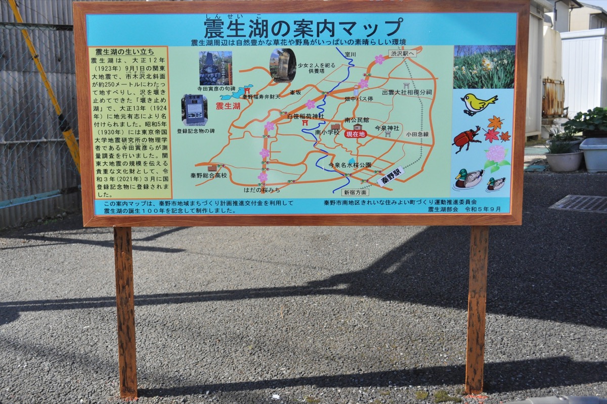 設置場所は秦野駅南口の野外彫刻「異石風景」前、今泉名水桜公園入口、秦野総合高校前、小原バス停横、震生湖駐車場、峰橋、みそだした公園、南公民館入口。案内看板では震生湖の成り立ちのほか、震生湖にまつわる石碑も紹介している。また、地図はわかりやすいよう8枚全て変え、各設置場所を起点として描いている。