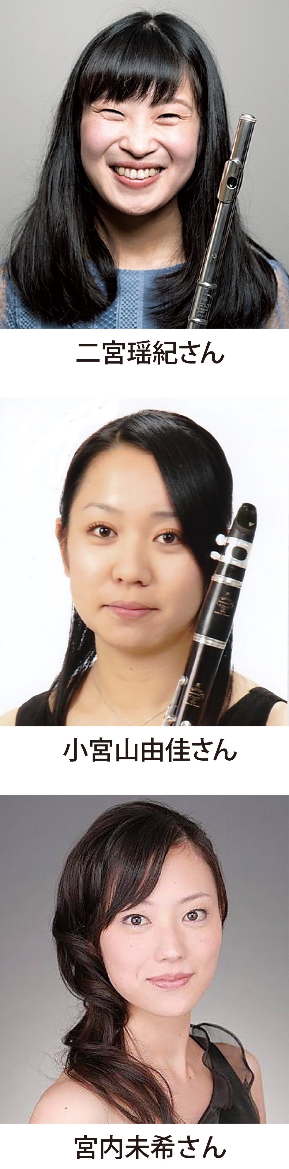 今回は「晩秋の風に音を重ねて」と題し、二宮瑶紀さん(フルート・秦野曽屋高校出身)、小宮山由佳さん(クラリネット・秦野曽屋高校出身)、宮内未希さん(ピアノ・南足柄市出身)を招く。演奏予定曲は『フルート・クラリネットとピアノのためのソナチネ(シュミット)』、『クラリネットのための主題(マンガーニ)』、『シルクロード(喜多郎)』、『リベルタンゴ(ピアソラ)』ほか。午前11時30分開演(11時開場)、午後1時終演予定。0歳児から入場OK。ベビーカー、離乳食の持ち込み可。予約制・先着30人。ホール事務室【電話】0463・81・1211へ。