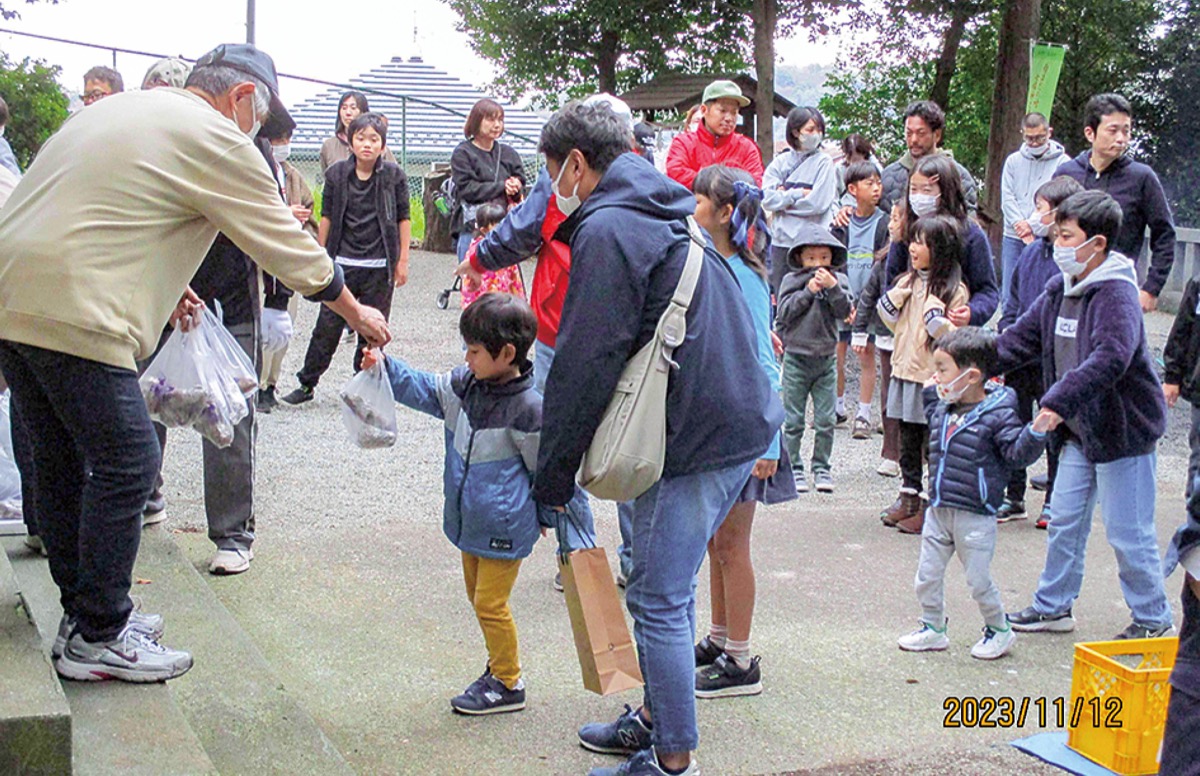 子どもたちの学習支援などを行う西大竹寺子屋が11月12日、嶽神社(秦野市西大竹)で「焼き芋のつどい」を開催した=写真上・提供。