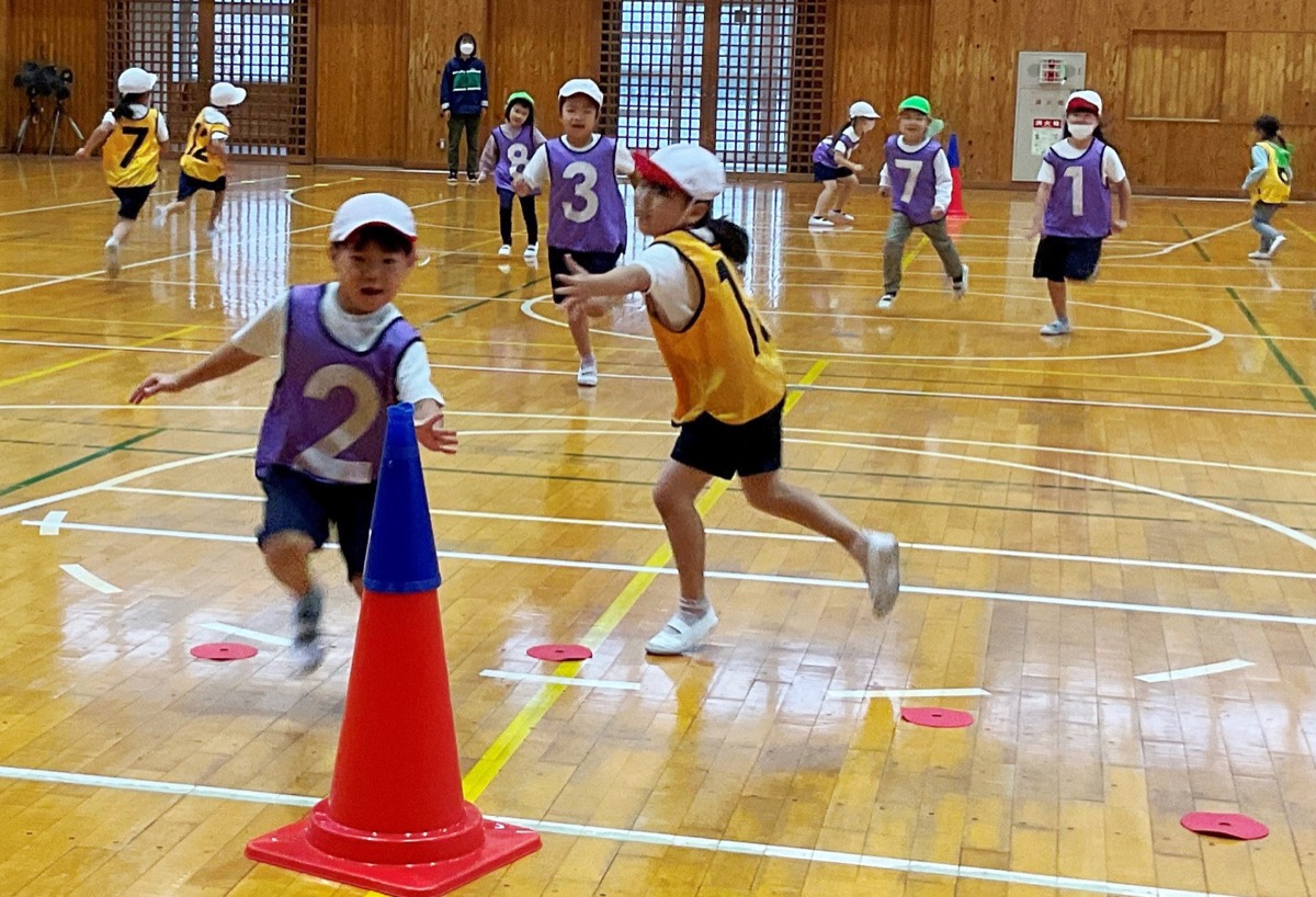 スポーツ鬼ごっこで北幼稚園と北小1年が交流