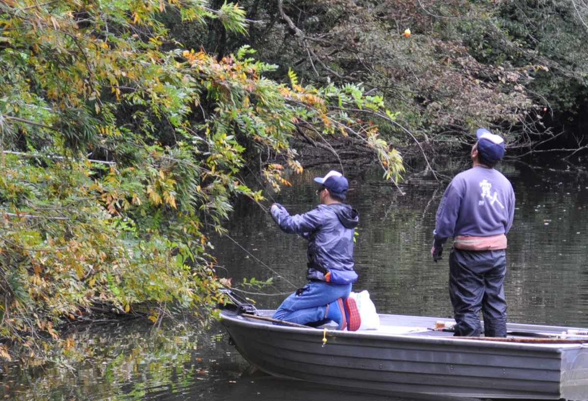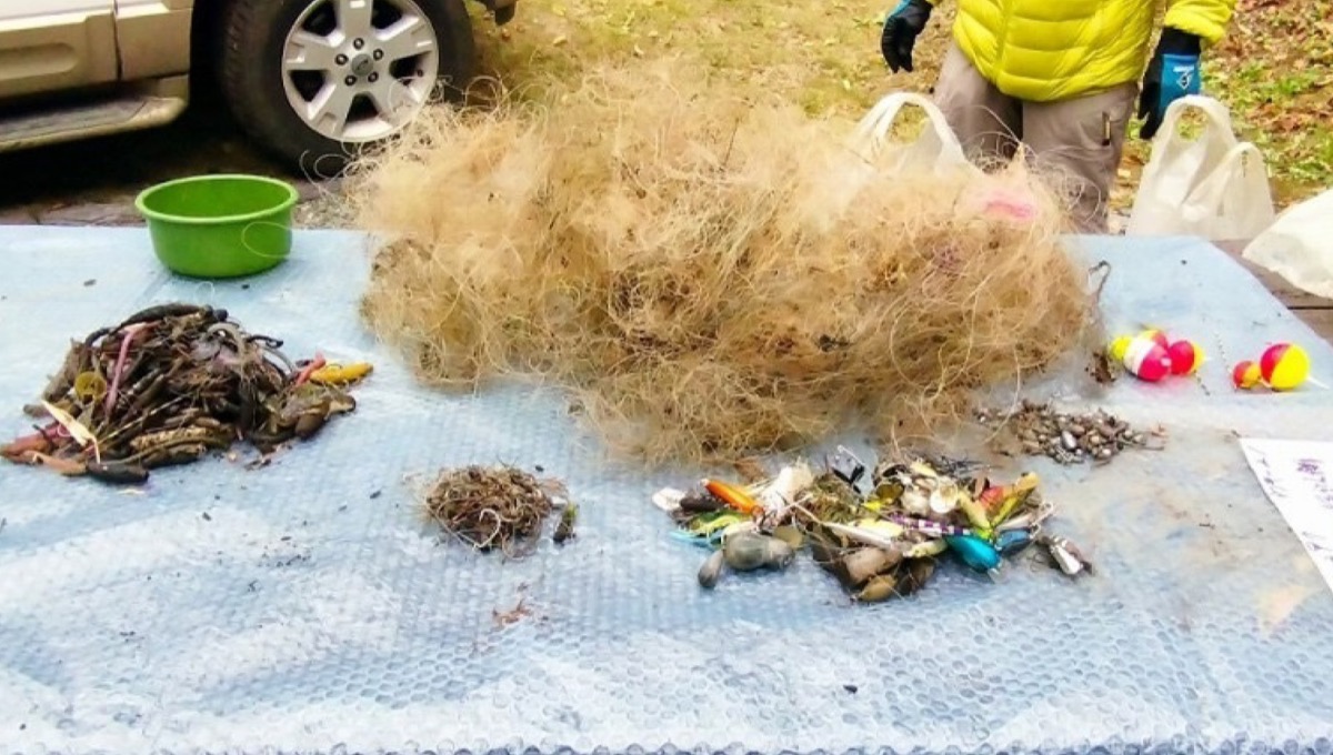 当日は震生湖の湖畔に集合し、二手に分かれて放置されたテグスや疑似餌などを回収して回った。また、昨年に続き釣り人が立ち上げたことから始まった水辺基盤協会がボートを投入し、湖上の木にかかっているテグスの回収も行った。