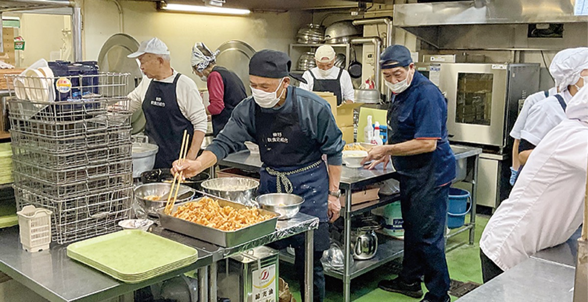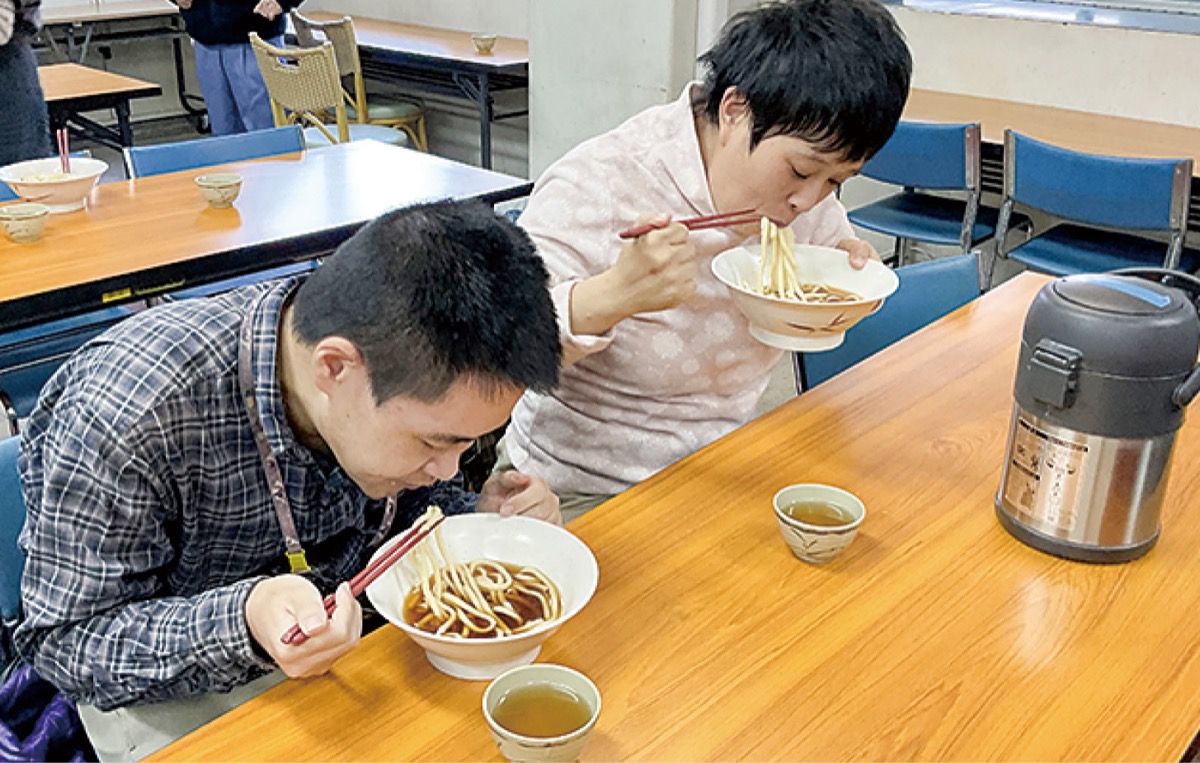 当日は同組合の役員が松下園を訪れ、厨房で連携しながら海老の天ぷらそば・うどんを用意。松下園利用者や職員がつゆの香りに誘われるように食堂に集まり、そばかうどんを選び注文。「美味しい」と夢中になって食べる姿が見られた。