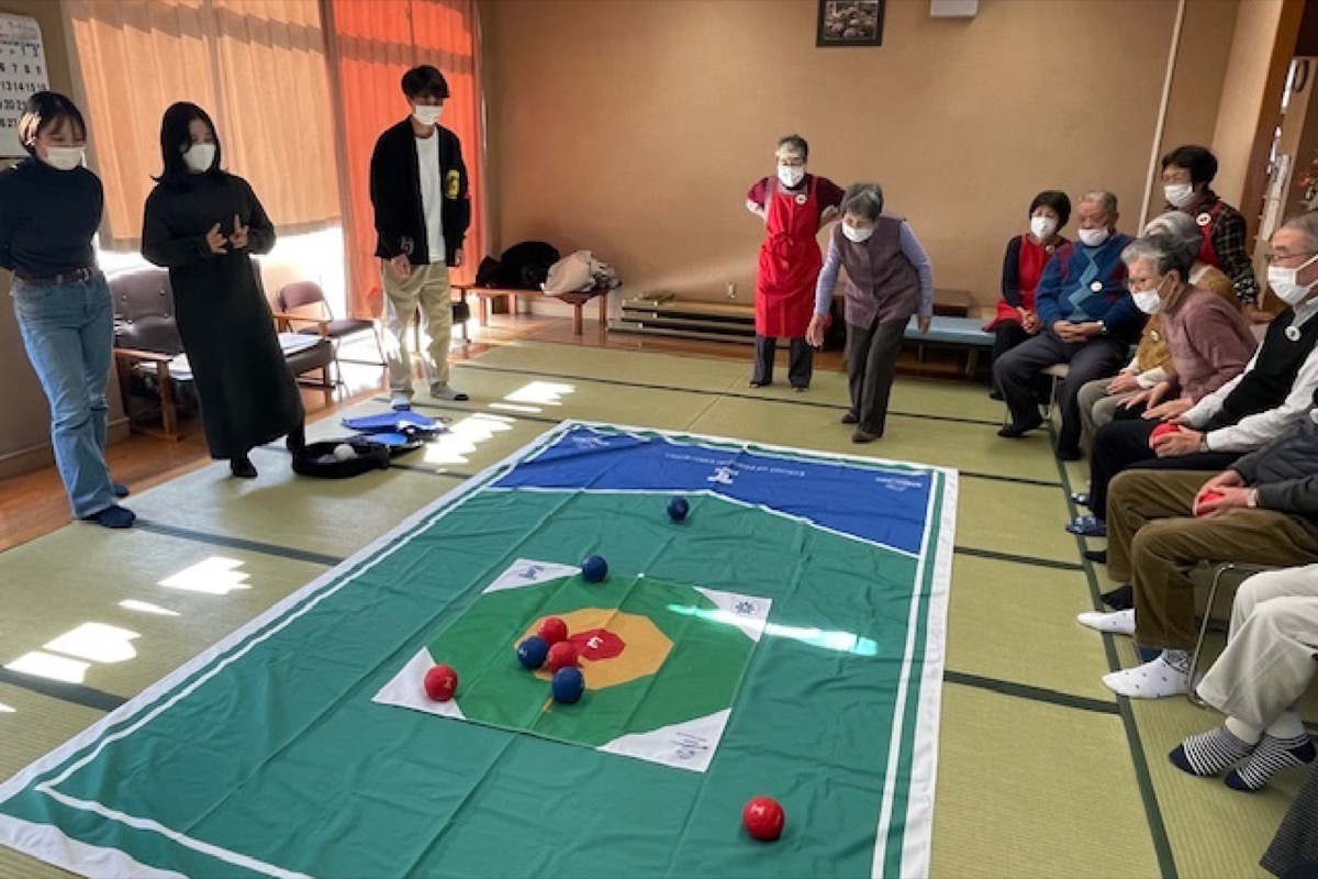 広畑ふれあいプラザ(秦野市下大槻174-4)の「いきがい型デイサービス」木曜班で12月7日、東海大学生が企画・運営したボッチャ体験教室が開催された。