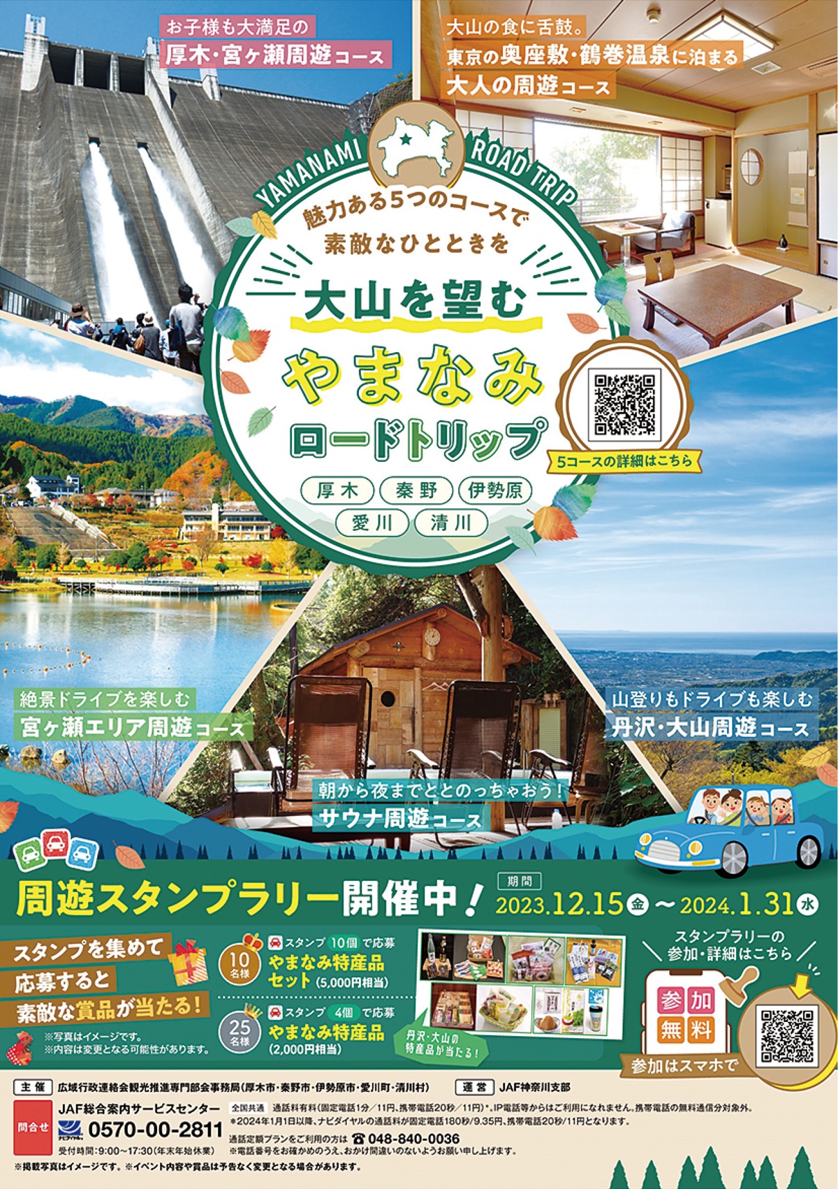コースを巡るスタンプラリーで、スタンプを4個集めて申し込むと2000円相当、10個で5000円相当の各市町村の特産品が抽選でもらえる。問い合わせは、JAF総合案内サービスセンター【電話】0570・00・2811、または「大山を望むやまなみロードトリップ」専用HPへ。