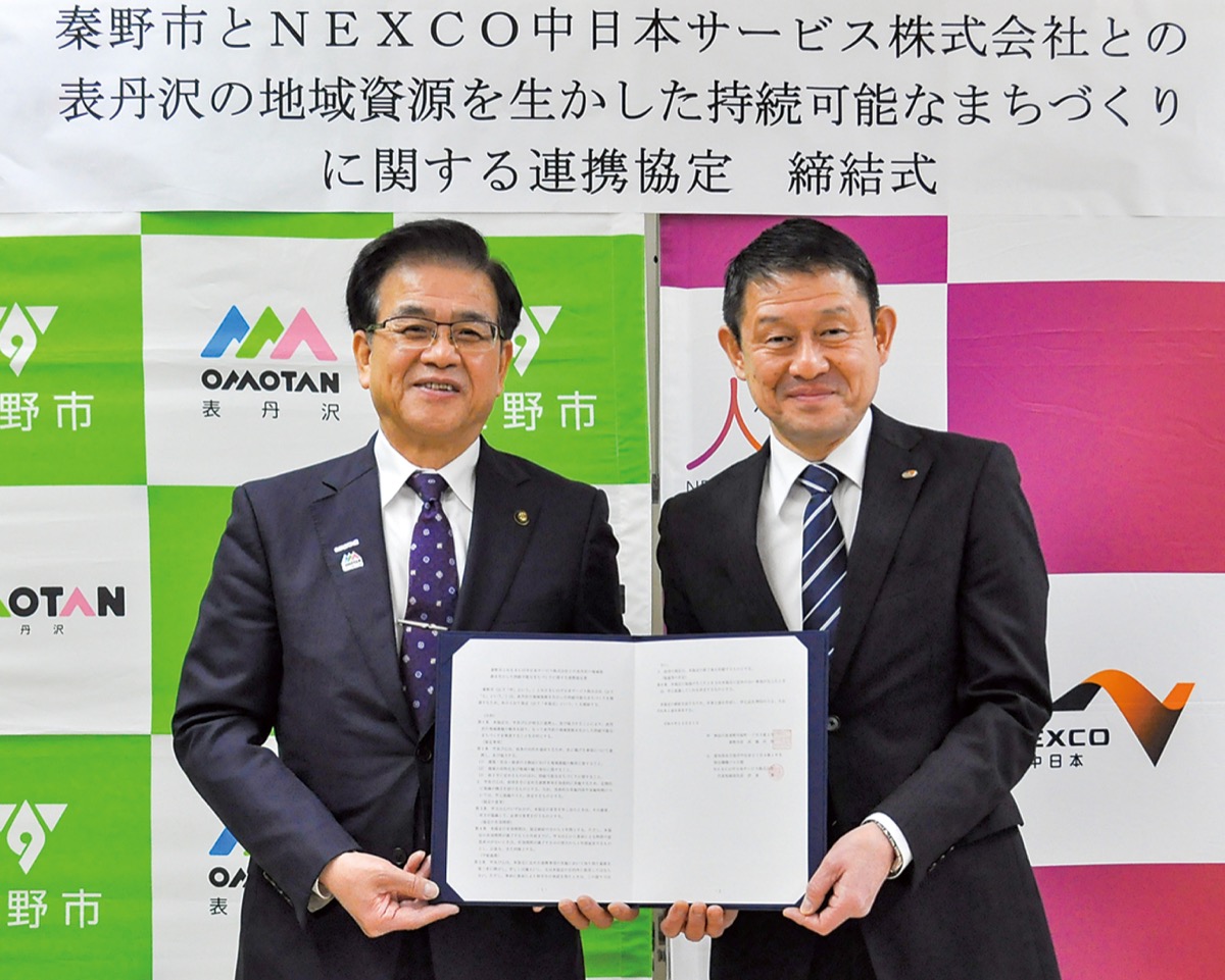 秦野市とNEXCO中日本サービス(株)(伊東要代表取締役社長)が昨年12月21日、「秦野市とNEXCO中日本サービス株式会社との表丹沢の地域資源を生かした持続可能なまちづくりに関する連携協定」を関東圏で初めて締結した。これにより、市は同社のノウハウを活用し、表丹沢の資源を生かした研修の実施や、地域課題の解決に取り組んでいく。