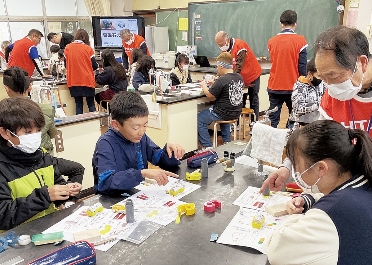 当日は5年生がモーターづくりに挑戦。乾電池につけた磁石の上に輪を作ったエナメル線を設置すると、くるくる回る「クリップモーター」づくりでは、形を細かく調整するなど試行錯誤を繰り返した。子どもたちからは「自分でモーターを作れると思わなかった」「一度回ったら、ずっと回っていた」「もっと早く回転させるにはどうしたらいいか」といった感想が。高学年理科専科の松岡文宏教諭は「製作の難易度が高いクリップモーターも、全員が回ったと喜んでいた。これは複数の支援があったからこそ。子どもたちにはモーターの仕組みが様々な所に使われていることを体験を通じて知ってほしい」と話した。