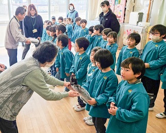 北幼稚園での贈呈式当日は、佐藤教育長や教育指導課指導主事、県人会のメンバー4人が出席。県人会の代表者2人が園児に「仲良く本を読んでね」などと声をかけ、絵本を手渡した。受け取った園児は「読んでみたいな」などの感想を話していた。
