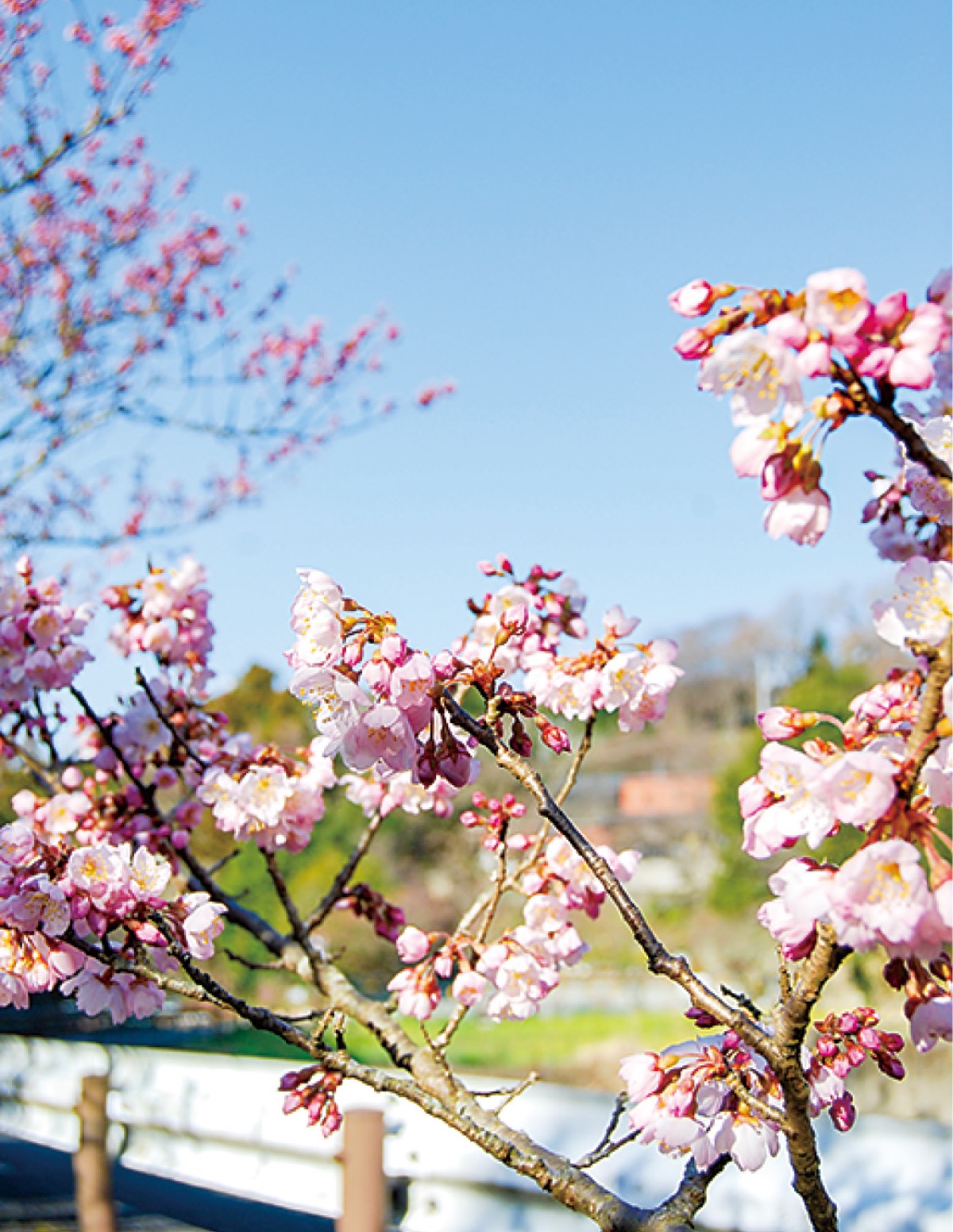 秦野市寺山の中丸沢の川沿いに植えられている「春めき桜」が咲き始めた。この桜は南足柄市で開発された早咲きの品種。ソメイヨシノよりひと足早く咲き出すことで知られ、この場所では「中丸の里山を守る会」の会員により約90本が植樹されている。