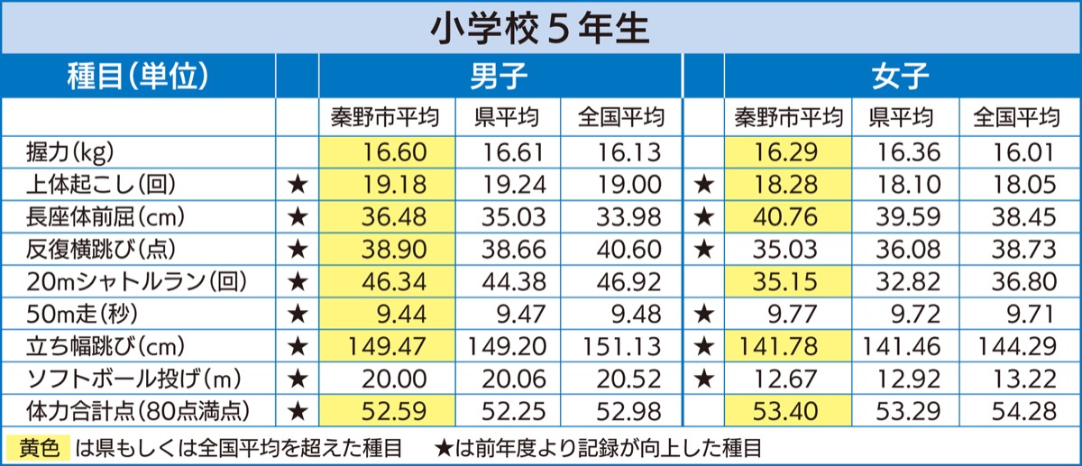 秦野市は2023年度の「全国体力・運動能力、運動習慣等調査」の結果を明らかにした。小学5年生男女の体力合計点が調査以来初めて県平均を上回り改善。市教育指導課は中学校の体育教諭などを小学校に派遣する「体力向上サポーター」の取り組みなどを要因として挙げた。