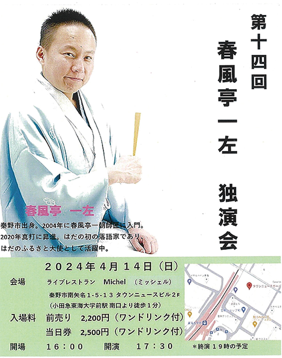 秦野市弥生町出身で「はだのふるさと大使」でもある落語家・春風亭一左さんの独演会が4月14日(日)、ライブレストランMichel(東海大学前駅徒歩1分)で開催される。