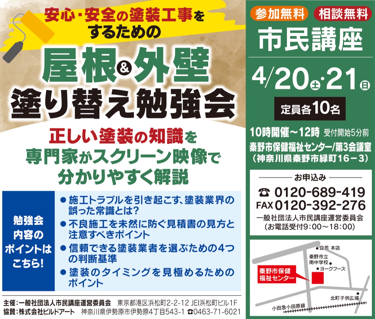 外壁塗装で多くの実績を誇る、創業15年の株式会社ビルドアートが協賛する塗装講座が4月20日(土)と、21日(日)、秦野市保健福祉センター(秦野市緑町16の3)の第3会議室で開催される。午前10時〜正午まで。(5分前受付開始)。参加無料・相談無料。定員各10人。