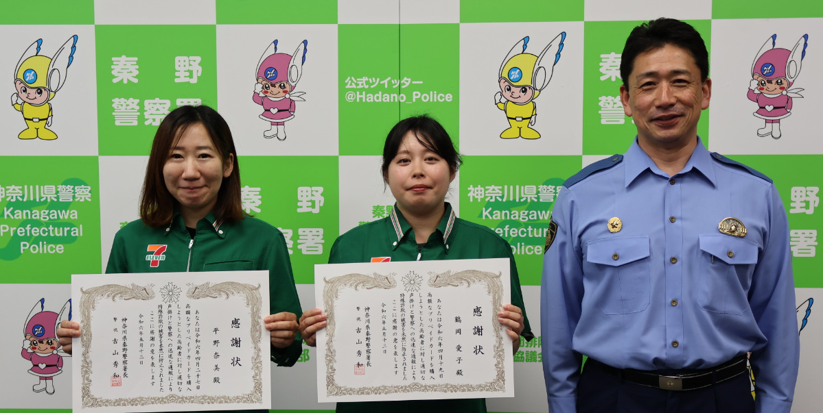 特殊詐欺被害を未然に防いだとして、秦野警察署は5月13日、セブン‐イレブン秦野鶴巻南2丁目店の鶴岡愛子さん(30)とセブン‐イレブン秦野寿町店の平野奈美さん(35)に感謝状を贈呈した。