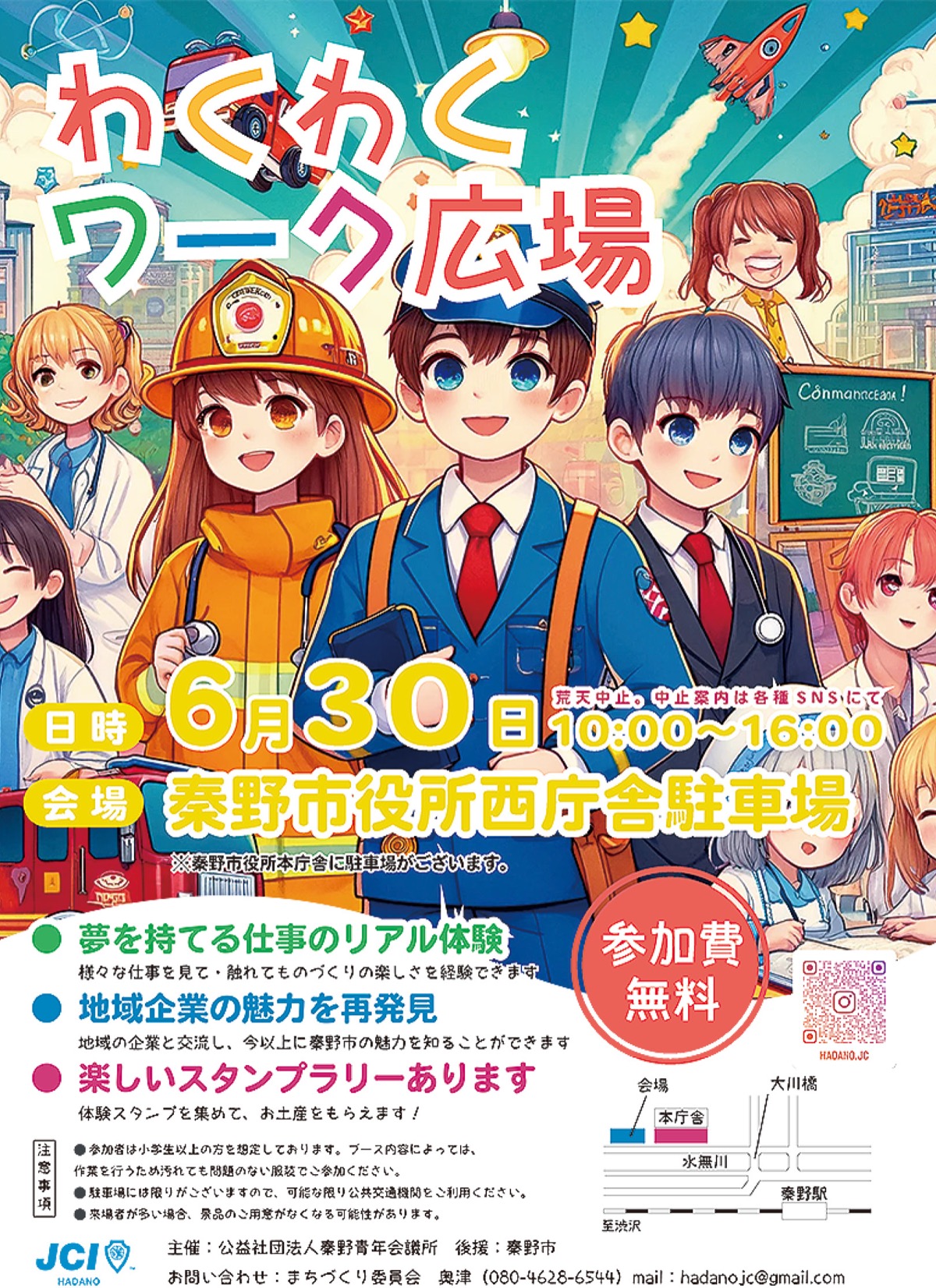 公益社団法人秦野青年会議所が主催する同イベント。小学生以上を対象に地元事業者が行っている仕事を知ってもらい、将来「秦野で働きたい」と思える意欲を育てようと実施する。この日は、木材を使ってモノづくりができる大工作業や電気工事などで使う高所作業車に試乗できる高所作業車体験、塗装体験、保護者向けには健康状態をチェックできる「保険ブース」「遺言書作成」などが行われる。スタンプラリーなども開催。