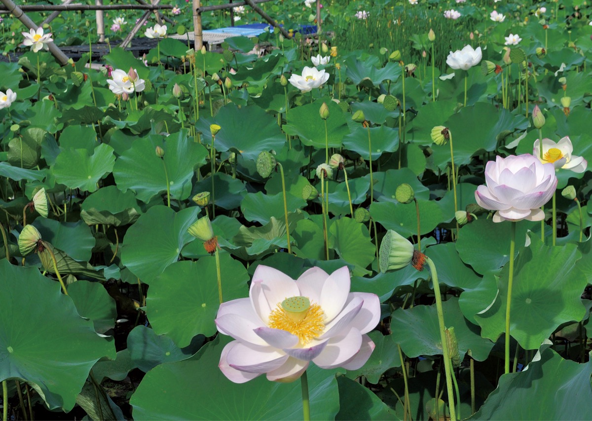 このハス田は、浅見さんが道行く人の目を楽しませたいと休耕地を活用して5年ほど前から整備を始めたもの。現在は300坪ほどの広さに、古代蓮、白光蓮、一天四海など12種類のハスが植えられている。観賞に訪れる人が多いことから、このほど手作りの木道を整備した。「さまざまな種類のハスを一度に楽しめる場所は珍しいのでは。今年は9月の上旬までは花が楽しめると思うので、ぜひ見に来てほしい」と浅見さんは話す。今後、ハス田の規模をさらに大きくしていく予定だという。