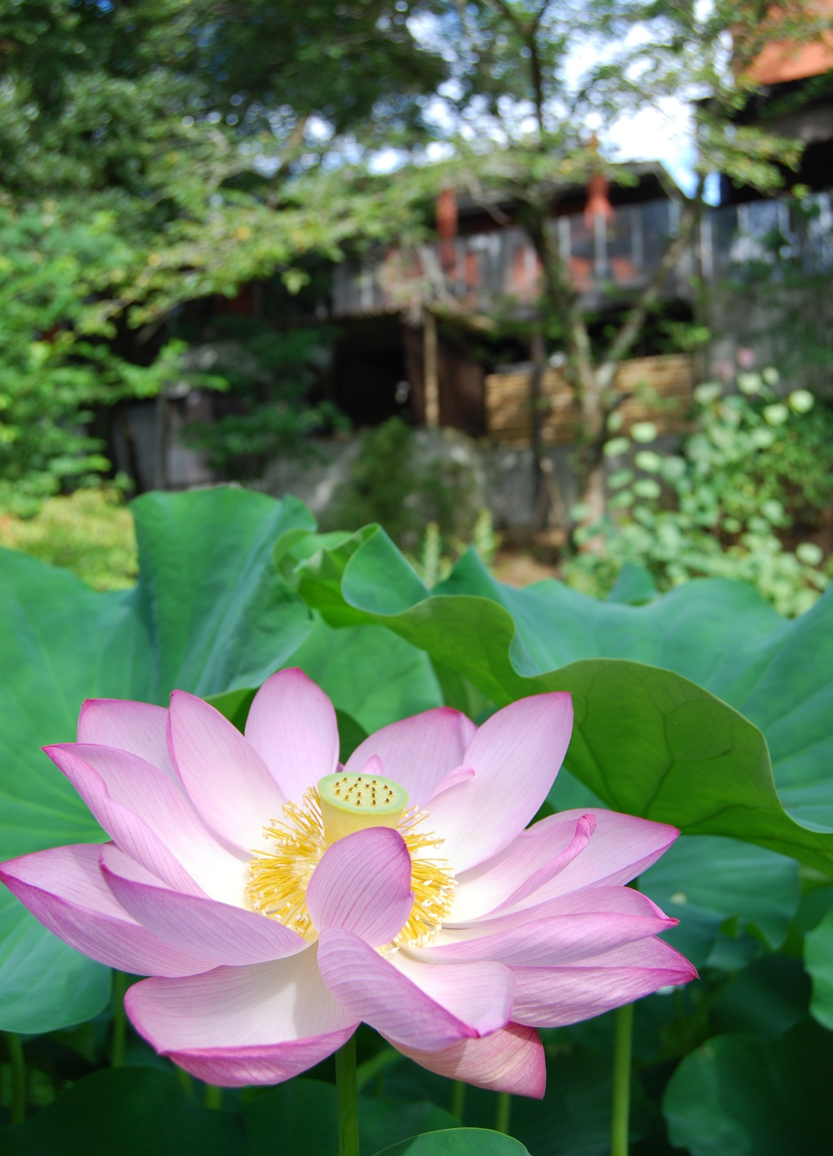 手打ちそば石庄庵(秦野市寺山1580)の一角にある池で、古代ハスが見頃を迎えている=写真。