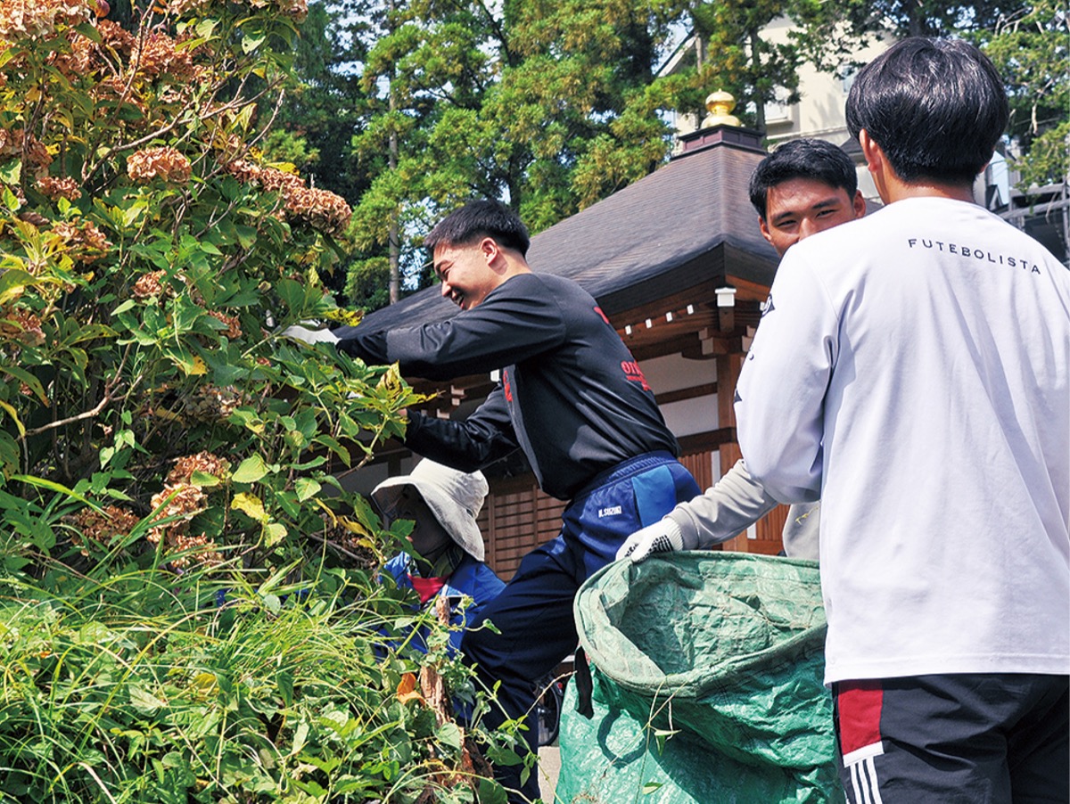 今年3月、矢名薬師堂前に同部の寮が移設された。今回の剪定は、東光寺の樋口亮翔さんから話を聞いた八百則和コーチが手伝いを申し出たことをきっかけに実現した。普段、あいさつを交わすことはあるものの、協力して剪定を行うのは初めてだという。