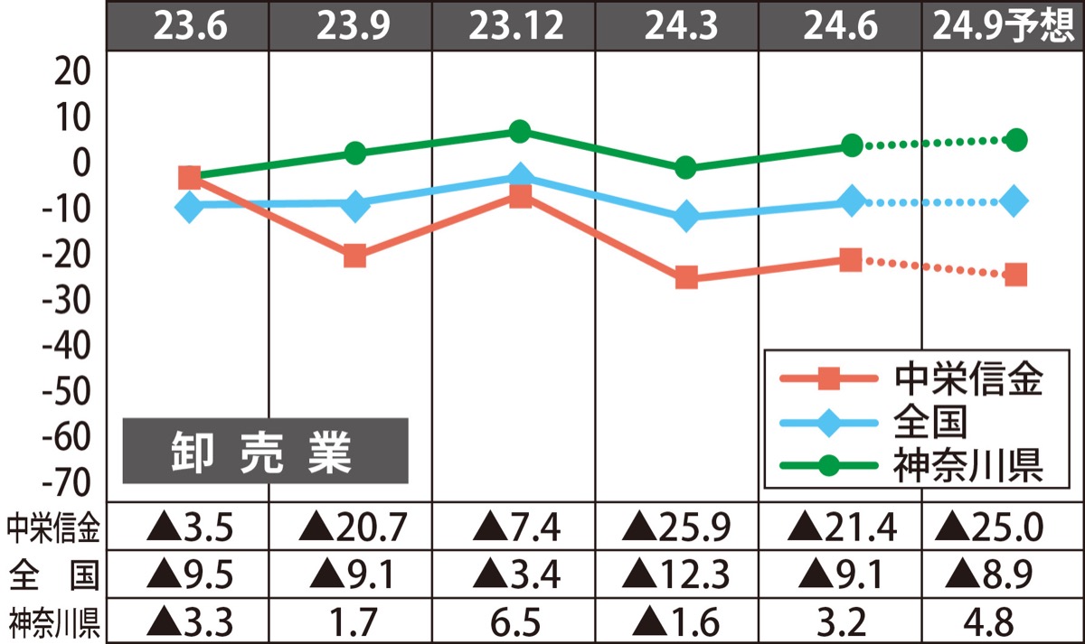 業況判断D.I.は前回調査比4・5ポイント改善の▲21・4。食品卸売業では主要取引先の業況回復に伴い、受注が安定した他、一部企業では新規取引先獲得の動きがみられたことも景況感改善の一因に。一方、仕入れ価格高騰分の販売価格への転嫁に苦慮する企業もみられた。建材卸売業では建設業の業況好調を背景に取引先数が増加した一方、人手不足や既存設備の老朽化による納期の長期化などが課題に。今期予想は3・6ポイント悪化の▲25・0。