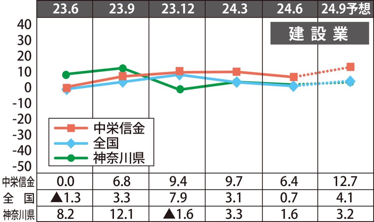 業況判断D.I.は前回調査比3・3ポイント悪化の6・4。主要取引先からの施工依頼数が安定的に推移している他、都内や県東部における建設需要の増加がみられていることからも好調を維持。5期連続のプラス域で推移している。しかし依然として人手不足感は強く、受注の機会損失や従業員の長時間労働が常態化。2024年問題による労働時間の上限規制が影響し、人繰りへの対応に苦慮する企業が増加している。今期予想は6・3ポイント改善の12・7。