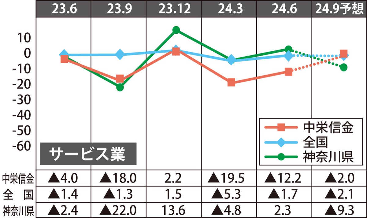 全業種総合の業況判断D.I.は▲(マイナス)7・2を示し、前回(24年1月〜3月期)と比べ6・9ポイント改善した。製造業では主要取引先からの受注状況の回復がみられ、介護業や理美容業などを中心に利用者数が増加し建設業、不動産業を除く4業種で業況判断D.I.が改善。一方、4月以降2024年問題による労働時間の上限規制が影響し、人繰りへの対応に苦慮する企業もみられた。