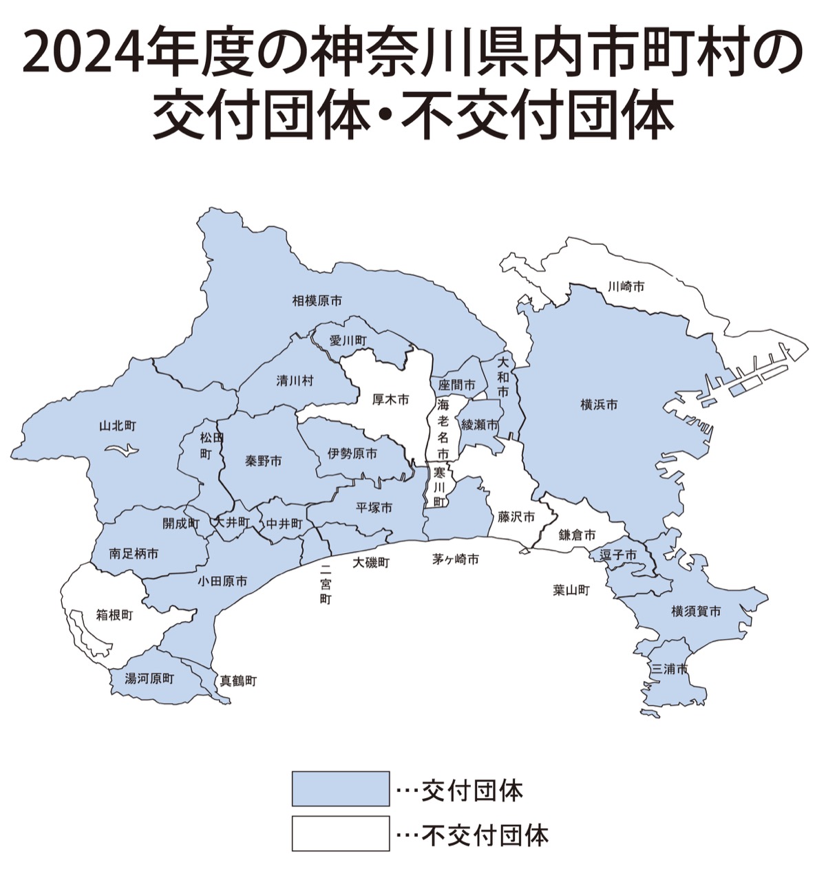 神奈川県内で対象となったのは前年度と変わらず26団体(14市11町1村)で、交付税に頼らず自前の税収で財政運営が可能な不交付団体も前年度と同様7団体だった。