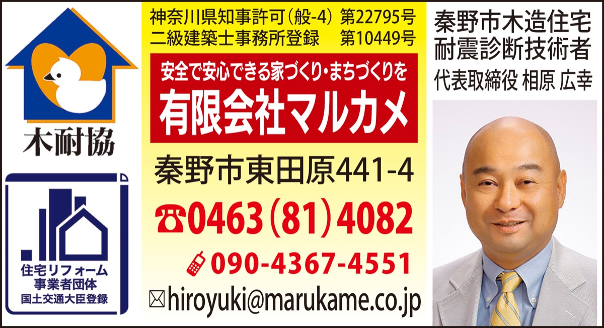 今は大丈夫に見えても、地震により何度も衝撃を受けると耐震性に問題が生じる場合も。秦野市では耐震診断、補強設計及び耐震改修工事の費用に補助も行っており、同社では申請に関する相談なども受け付けている。「防災グッズの見直しと共に、この機会に住宅の耐震も見直してほしい」と話している。