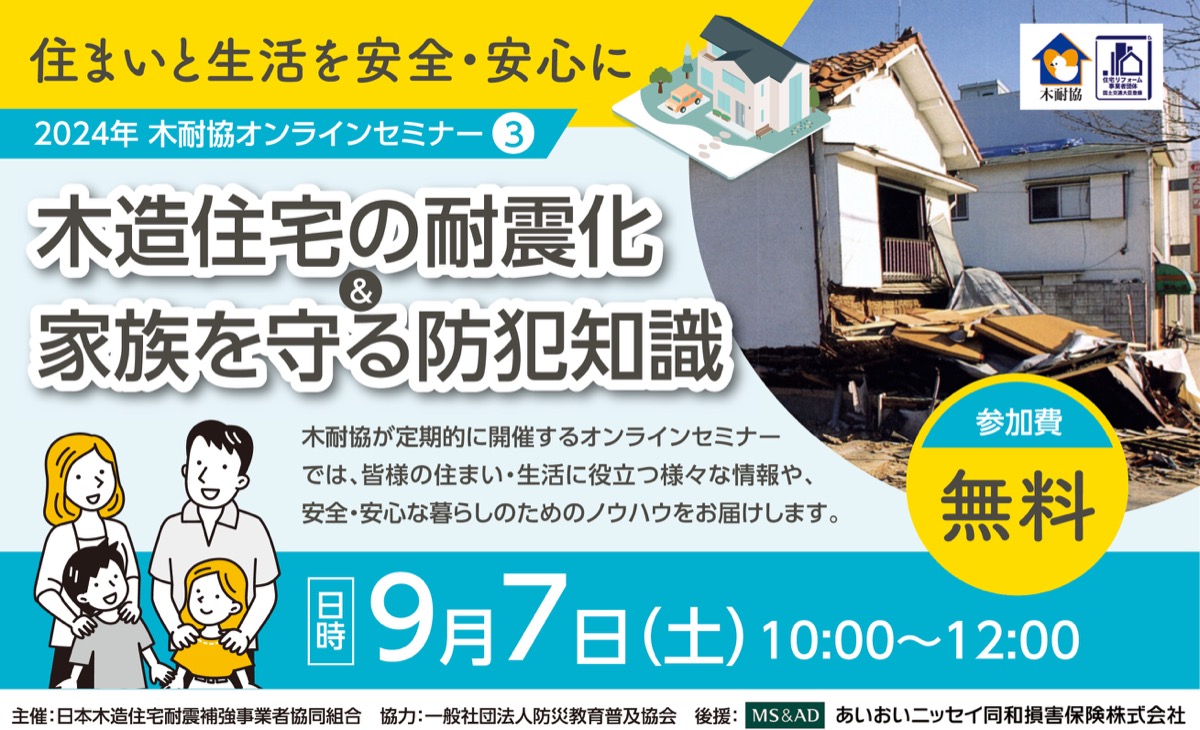 地震活動への注意が必要となるなか、日本木造住宅耐震補強事業者協同組合(木耐協)が9月7日(土)、無料のオンラインセミナー「木造住宅の耐震化&家族を守る防犯知識」を行う。