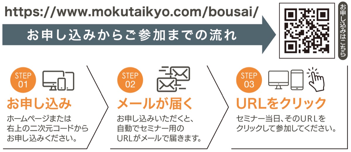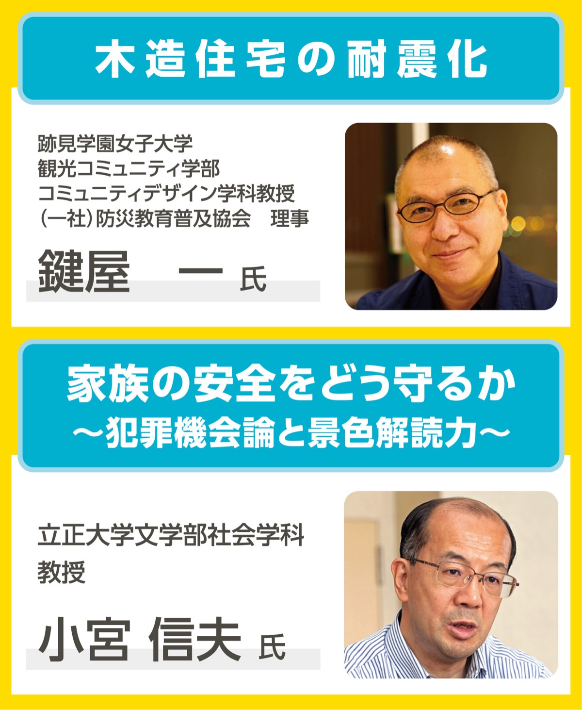 セミナーの第1部では防災教育普及協会の理事である鍵屋一氏が防災対策の要である「木造住宅の耐震化」について解説。第2部では犯罪学の専門家である小宮信夫氏から犯罪から家族を守るため「景色」から読み解く防犯対策などを学ぶことができる。参加費は無料。希望者は木耐協のホームページ又は二次元コードから申し込みを。