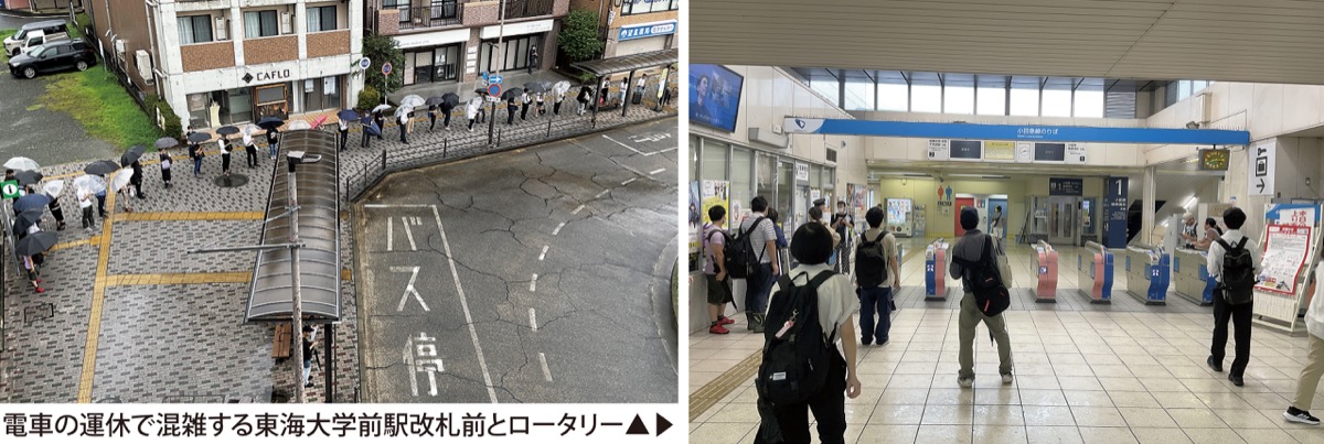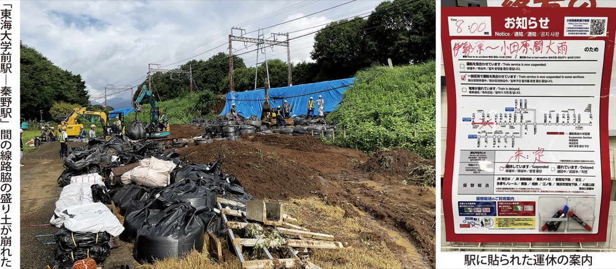 大雨の影響で、幹線道路や高速道路、鉄道にも被害は拡大した。小田急線は「東海大学前駅-秦野駅」間で線路脇の盛り土が2カ所流出し一部区間が運休。早朝の東海大学前駅は駅員に状況を確認する多くの人で混雑し、バスを待つ長い行列もできた。復旧作業は夜通し行われ、1日夕方に運転が再開された。