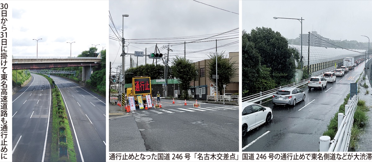 また、中日本高速道路(株)は通行止めが続く国道246号の代替路措置として、新東名高速道路と東名高速道路の無料通行措置を実施。対象区間は「厚木南IC-秦野丹沢SIC・新秦野IC」「伊勢原大山IC-秦野丹沢SIC・新秦野IC」「厚木IC-秦野中井IC・大井松田IC・秦野丹沢SIC・新秦野IC」「厚木南IC-秦野中井IC・大井松田IC」。同区間の利用のみ対象。同区間を超えて通行する車両は対象外(同区間を含め通常の通行料金が必要となる)。ETCレーン通過時、利用履歴が表示されるが、通行料の請求はない。全車種対象。実施期間は国道246号の通行止め解除まで(9月3日起稿)。