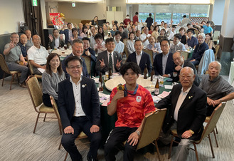 グランドホテル神奈中秦野で行われた祝勝会には、島田さんや石庄庵店主の石井貞男さん、高橋昌和市長ら秦野の有志62人が参加。実物の金メダルを間近に見て触れた参加者らは「想像以上に重かった」「首に掛けさせてもらって感動した」「清岡選手の活躍でオリンピックをより身近に感じられた」など、感想の言葉を口にした。