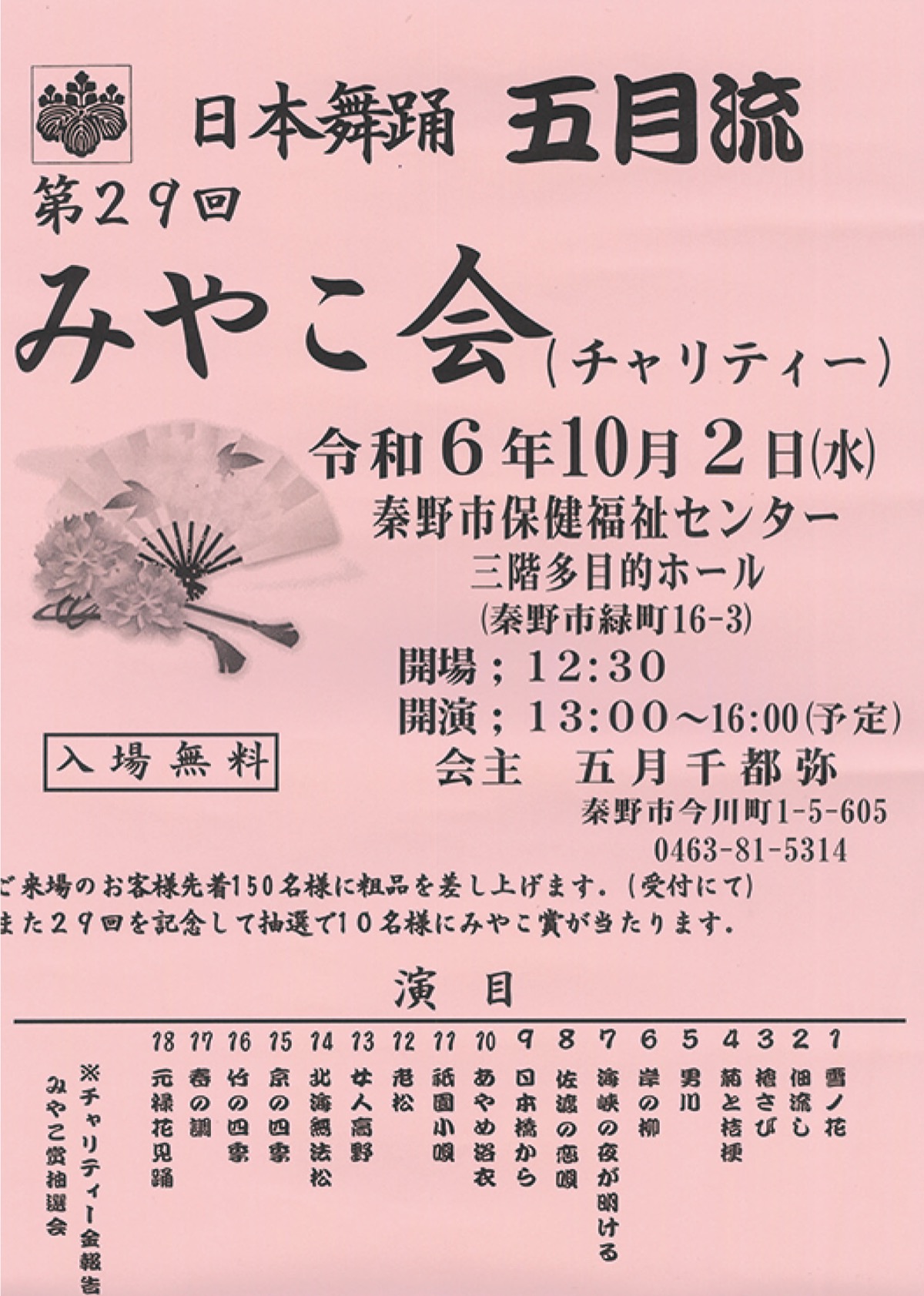 日本舞踊五月流みやこ会(五月千都弥(さつきせんつや)会主)による第29回チャリティー公演が10月2日(水)、秦野市保健福祉センター(緑町16の3)3階多目的ホールで開催される。開場午後0時30分、開演1時(終演は4時予定)。入場無料。