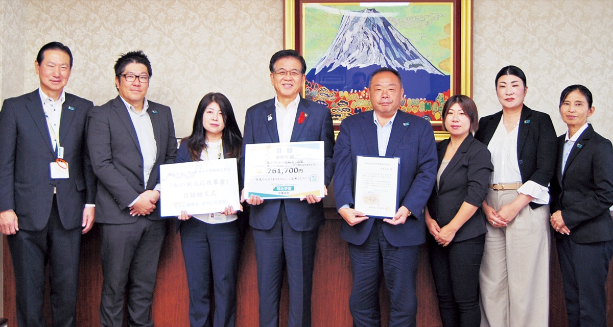4日に行われた贈呈式には、山本支社長や山口正宏秦野営業所長ら7人が出席。高橋昌和市長に目録が手渡された。山本支社長は「年々、多くの寄付が集まっています。今後も様々な社会貢献の取り組みを継続して実施していきたい」と話した。また、高橋市長は「このような寄付をいただき、ありがとうございます。これからもお力添えをよろしくお願い致します」と感謝の言葉を口にした。