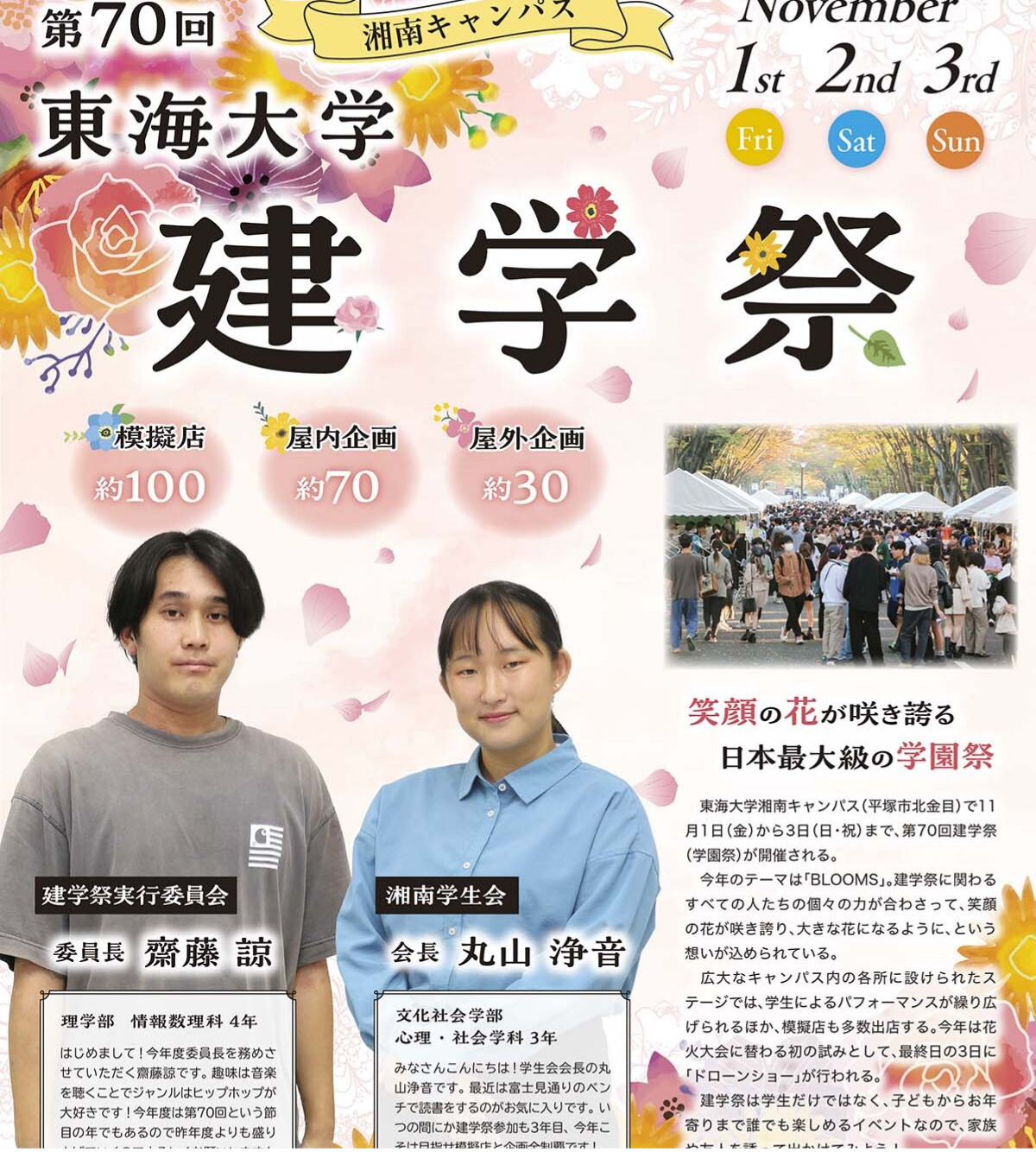 東海大学湘南キャンパス(平塚市北金目)で11月1日(金)から3日(日・祝)まで、第70回建学祭(学園祭)が開催される。