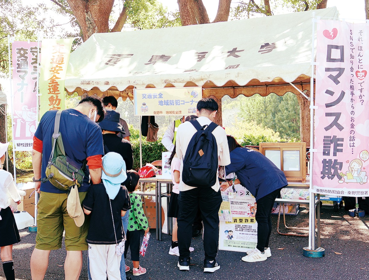 秦野市と秦野防犯指導員連絡会が10月12日、東海大学湘南キャンパスで行われた「グローカルフェスタ」に参加し、特殊詐欺や自転車盗の被害防止活動を行った。
