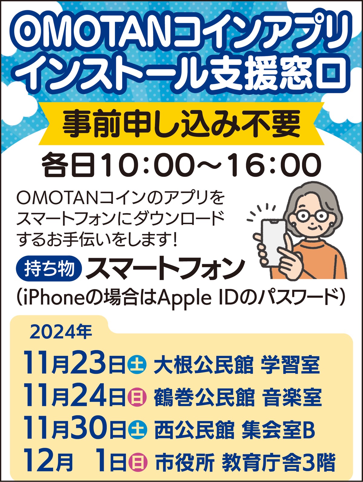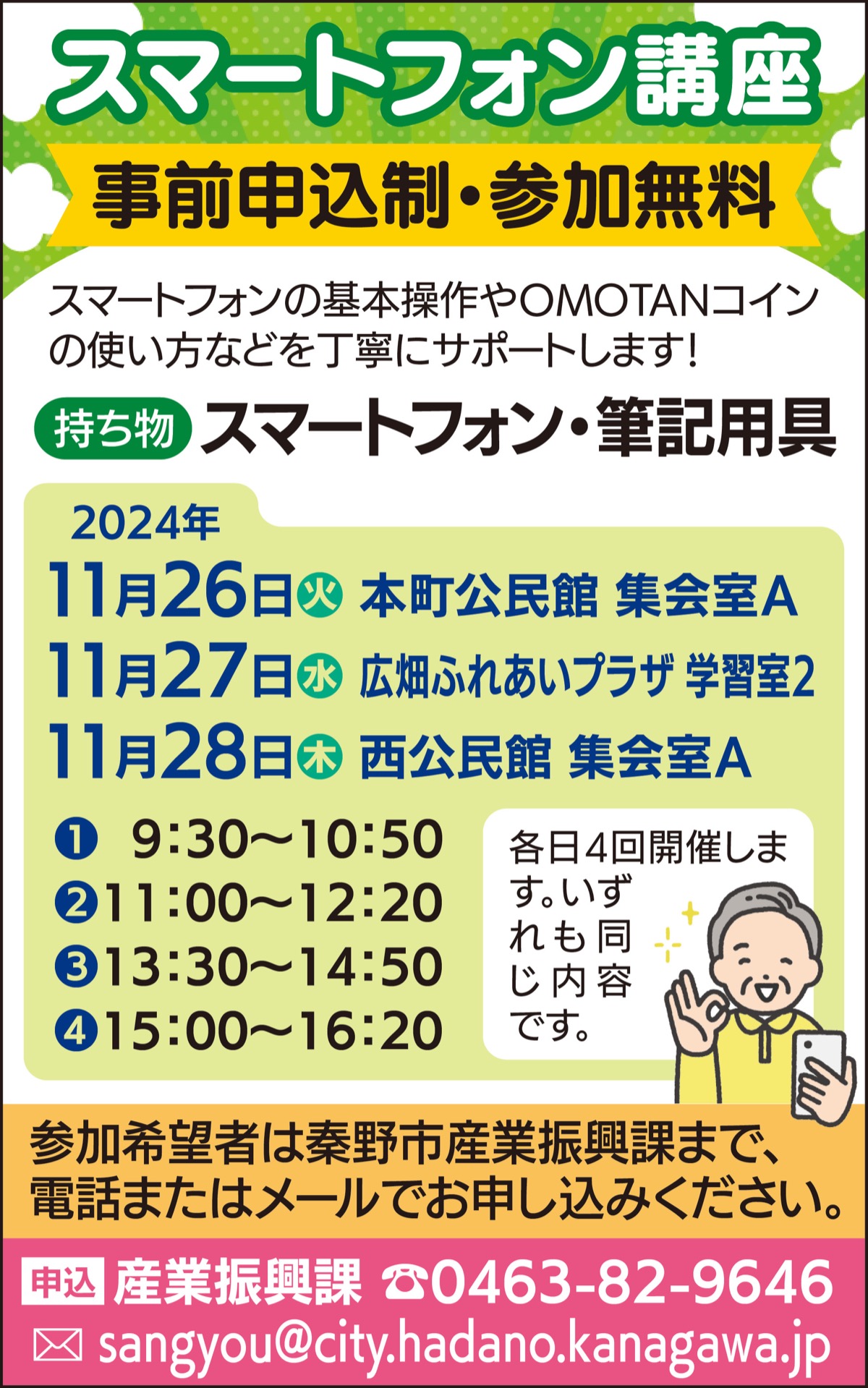 また、スマートフォンの操作に不慣れな人を対象とした「スマートフォン講座」も開催。基本操作からOMOTANコインアプリの使い方などを丁寧に教えてもらえる。同講座は事前申込制。希望者は秦野市産業振興課まで申し込みを。