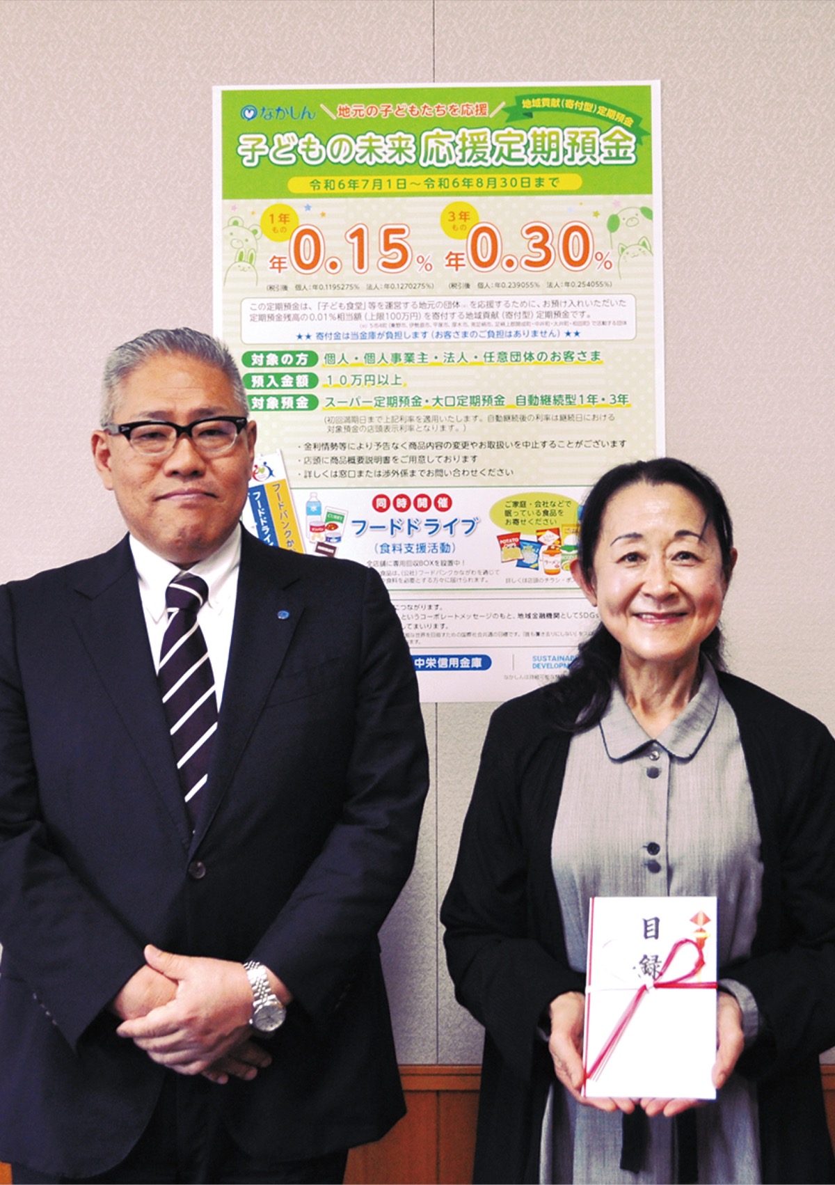 地域の子どもたちを取り巻く課題解決に向けた「子どもの未来応援プロジェクト」に取り組んでいる中栄信用金庫(本店・秦野市元町/北村圭一理事長)が、「なかしん子ども食堂応援金」を地元の14団体に寄付する。応援金寄付団体を代表して、「みんなの食堂☆ラパニス」の前田裕美代表が10月31日、同金庫本店で北村理事長から目録を受け取った。「みんなの食堂☆ラパニス」は、秦野市の子ども食堂の一つ。秦野精華園(秦野市南矢名3の2の1)で水曜日などに朝食を提供している。