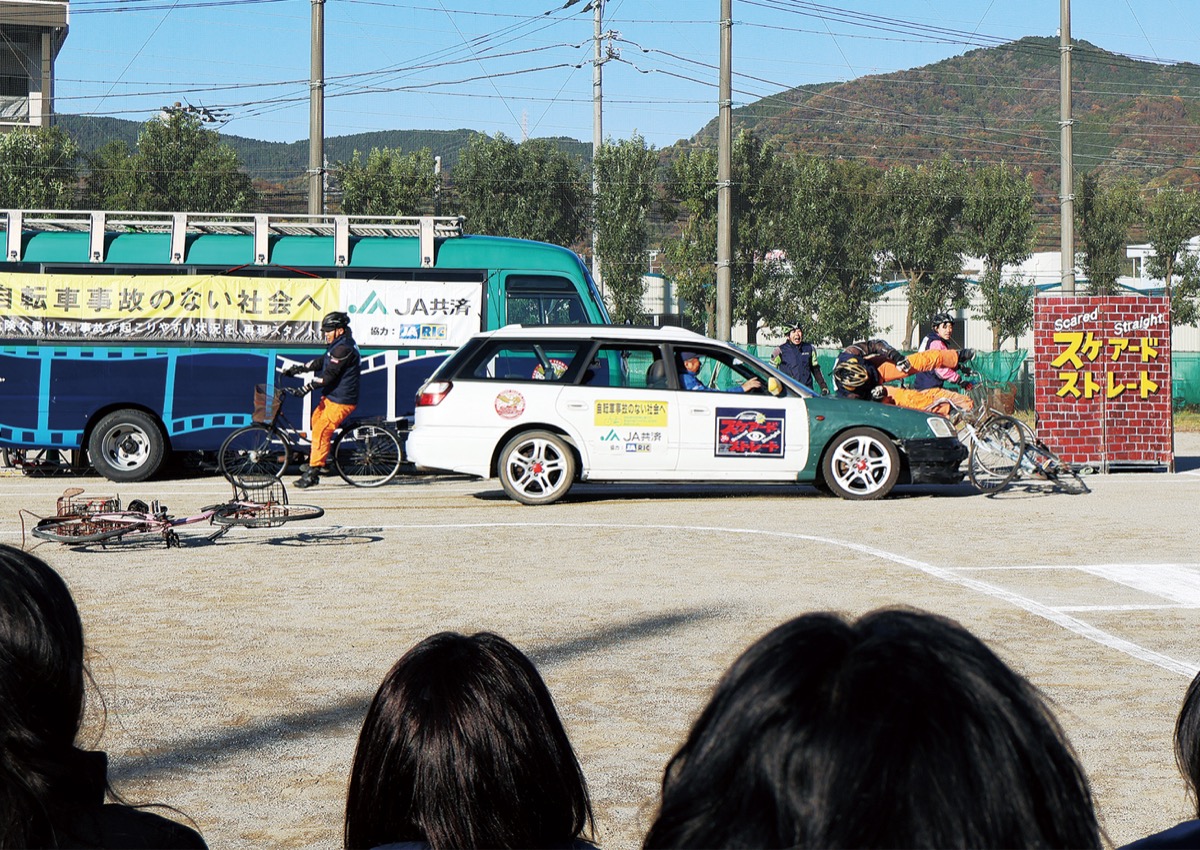 当日は、ながらスマホやヘッドホン、右側走行などの違反をしている自転車が、交通事故に巻き込まれる様子などがスタントによって再現された。急ブレーキ音や、自転車と人が弾き飛ばされる様子など、その迫力と衝撃に生徒らからは悲鳴やどよめきが上がった。