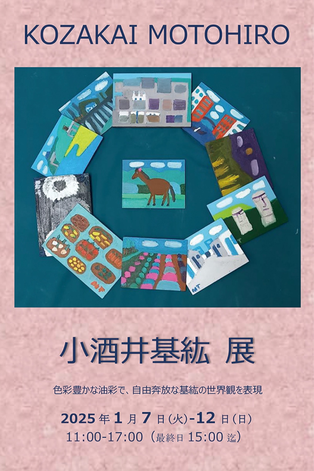 知的障害をともなう自閉症がある小酒井基紘(もとひろ)さん(秦野市在住)の個展が1月7日(火)〜12日(日)、Gallery1045(東横イン湘南平塚駅北口1/1F)で開かれる。午前11時から午後5時(最終日3時)、入場無料。