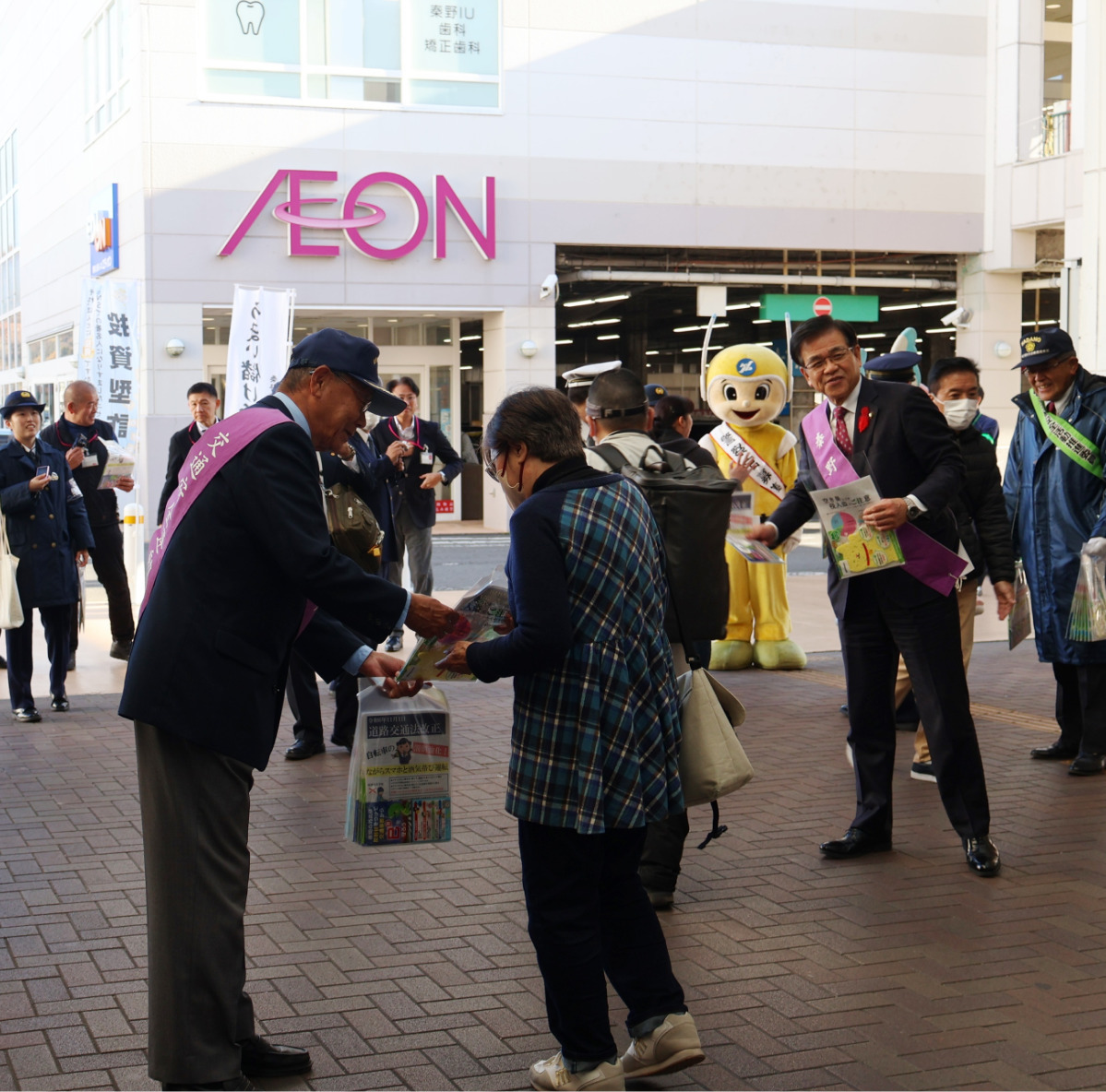 12月は交通事故が多くなる時期であるとともに、空き巣などの犯罪被害も増加することから、交通事故の防止と自主防犯意識の高揚を図るために実施されている。当日は高橋昌和市長をはじめ、古山秀和警察署長、交通安全協会の宇佐美一生会長、安全運転管理者会の田村一彦会長、防犯指導員連絡会の澁谷和之会長ら交通安全・防犯関係団体が参加。同ショッピングセンターの入口近くで、利用者にチラシや啓発品を配布し、注意を呼び掛けた。チラシには、空き巣対策のほか、11月に施行された道路交通法改正による自転車に関する罰則について、自転車のヘルメット購入補助の案内などが記された。