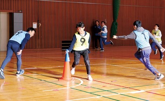 スポーツ鬼ごっこは相手チームのコートに攻め込み、時間内に相手のトレジャー(宝)を多く獲得した方が勝ちとなるスポーツ。相手に攻め込む人、宝を守る人の両方が必要で、仲間同士のコミュニケーションも重要となる。生徒たちは、初めは守りが薄くなったり、攻めあぐねていたが、実践を重ねるごとに相手の隙を突いて宝を獲ることが上手くなり、遊び感覚で楽しそうに体を動かしていた。