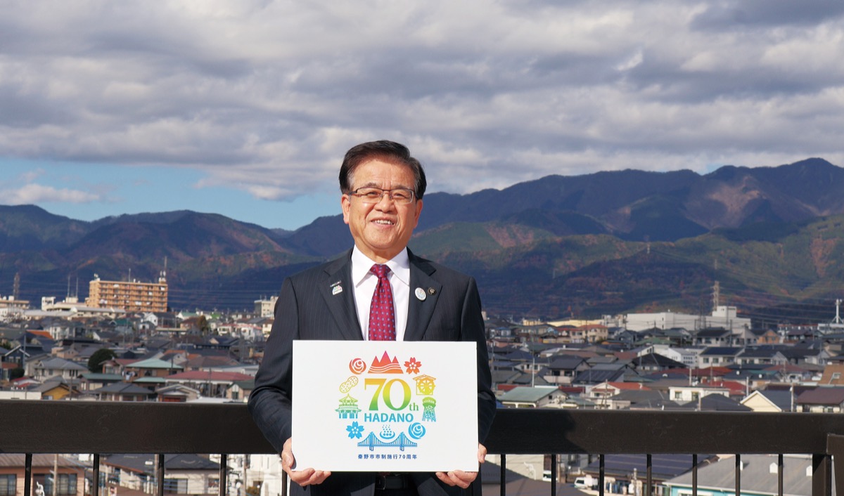 「昭和30年に2町2村が合併し、人口3万5千人のまちとして誕生した秦野市は、70年の時を経て、16万人が暮らす県央西部の広域拠点都市に発展しました。市制施行70周年は、本市の歴史を振り返り、未来につなげる節目の年です。これまで、本市の発展にご尽力いただいた先人の努力に深く敬意を表するとともに、本市を支えてくだる市民や事業者をはじめ、全ての方々に、心より感謝を申し上げます。