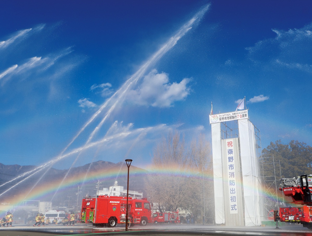 最後は消防隊による演技と一斉放水。天高く上がった放水が大きな虹を生み、会場からは歓声と拍手が沸き起こった。