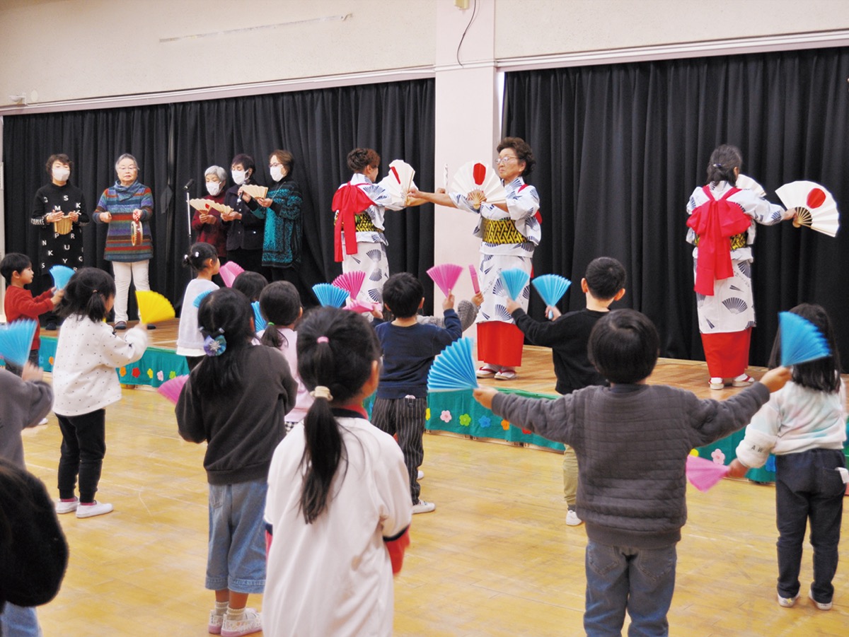 ささら踊り保存会(泉田(せんだ)悦子会長)が1月17日、北幼稚園(北村亜弥園長)で年少・年長の園児にささら踊りを披露。歴史や踊り方について教えた。