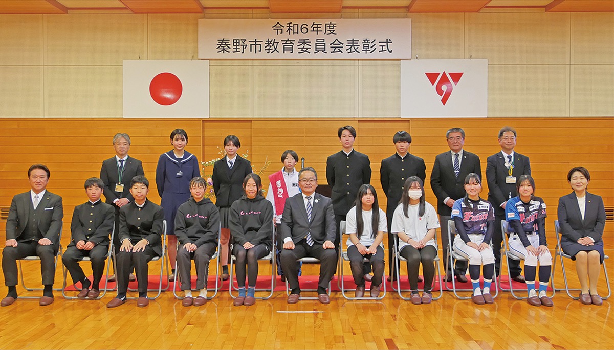 2024年度秦野市教育委員会教育長表彰式がこのほど、メタックス体育館はだの(総合体育館)で行われた=写真。文化・スポーツなど、特定の分野で活躍した小中学生や高校生などを表彰するもの。今年度は33人、7団体が表彰された。表彰者・団体は次の通り。