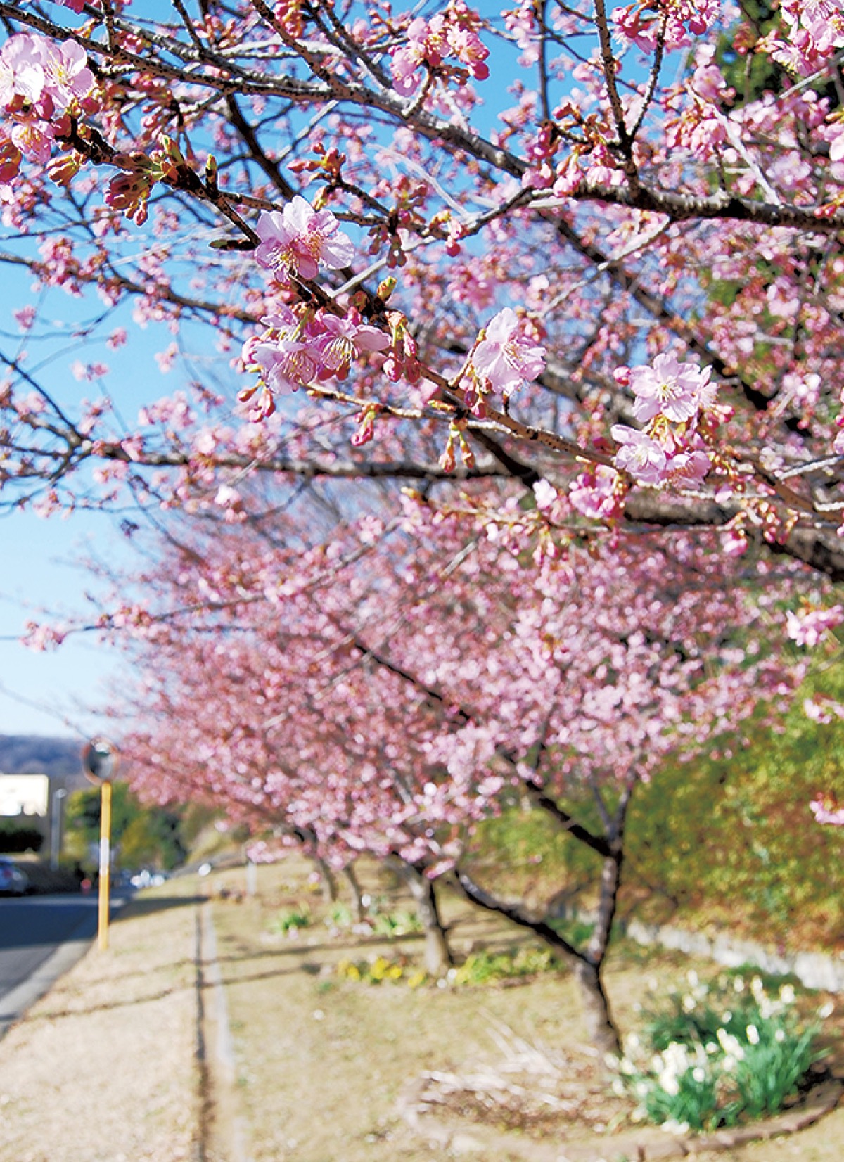 この河津桜は「ハイウェイパーク下大槻の河津桜を守る会」が年に数回、下草を刈るなど管理を行っているもの。同会会長の杉山勉さんは「今年は寒い日が続いたので、例年より開花が遅めでした。3月20日ごろまで楽しめると思います」と話す。